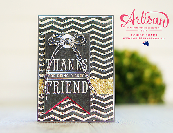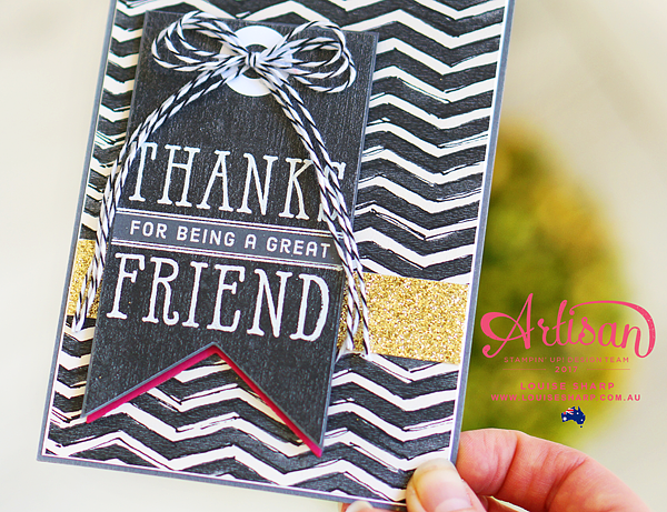 The stamp set is from the Window Shopping stamp set and I have been wanting to use it for a while now - it's finally seen the daylight! I stamped the image straight onto the paper with Versa Mark and set it with White Embossing Powder - looks like the chalk board effect without all the work because the paper did it all for me....I love it when things like that happen #winning!