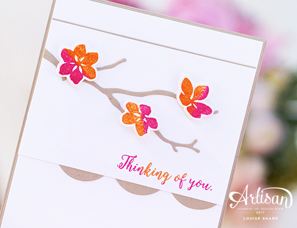 I stamped half the flower in Melon Mambo and the other half in Pumpkin Pie to create the two-tone effect on the flowers. The two tone sentiment was created by using a dauber to coordinate with the flowers. I wanted to keep my card simple and clean as I felt it gave the oriental feel I wanted achieve using this beautiful set.